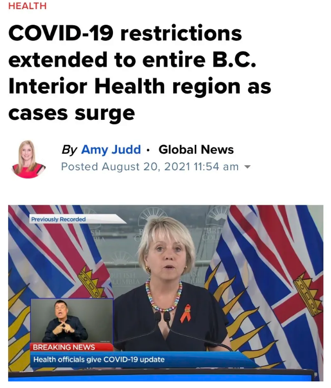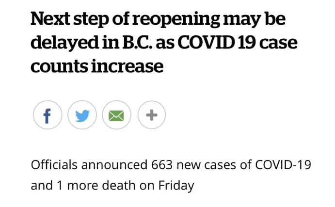 BC省卫生官于8月20日表态,由于省内新冠病例的持续激增,光周五一天的时间就报告了663例新病例和1例死亡病例BC省将紧急按下暂停键,停止下一步解封措施