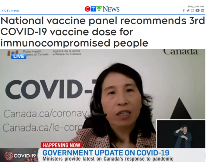 就在刚刚,加拿大公共卫生局(PHAC)官方宣布,根据加拿大国家免疫咨询委员会(NACI)发布的最新防疫指导表示,加拿大首席卫生管Theresa Tam建议,所有现居住于加拿大12岁以上并且中度或重度免疫功能低下的人,需要接种额外的一剂疫苗,也就是第三剂新冠疫苗,因为这个人群很可能对最开始接种的两针疫苗无法产生足够的免疫。