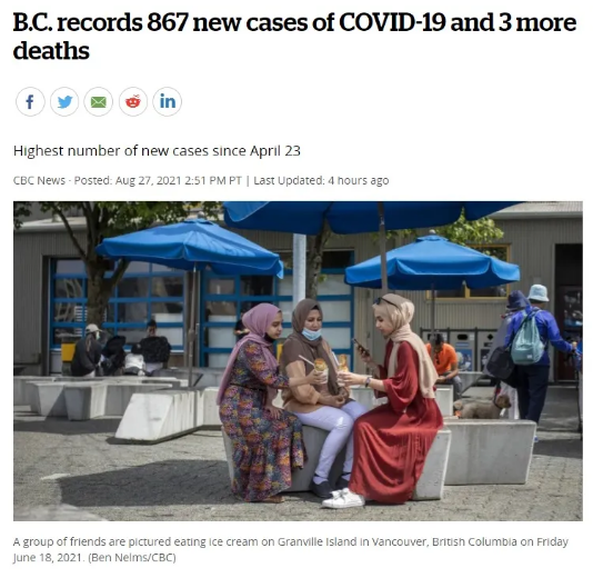 BC省在过去的24小时内增加了867例新冠感染病例,和前两周的数据相比已经翻倍了,由此可见这次的变种病毒来势汹汹啊!