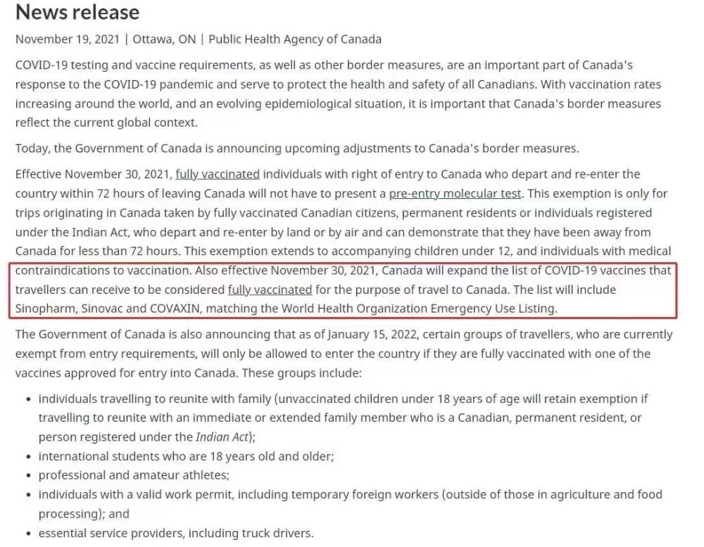 除了放宽入境政策之外,加拿大联邦政府还扩大了认可的疫苗名单。从11月30日起,接种了两针中国国药(Sinopharm)、科兴(Sinovac)和科瓦克辛(Covaxin)新冠疫苗的旅行者也将被加拿大联邦政府视为完成免疫新冠接种全流程。换句话说,从11月30日开始,所有被世界卫生组织(WHO)纳入紧急使用名单的新冠疫苗都被加拿大认可了,其中包括:辉瑞(Pfizer)、莫得娜(Moderna)、阿斯利康(Astrazeneca)、强生(Janssen)、中国国药(Sinopharm)、科兴(Sinovac)和科瓦克辛(Covaxin)这七种新冠疫苗。